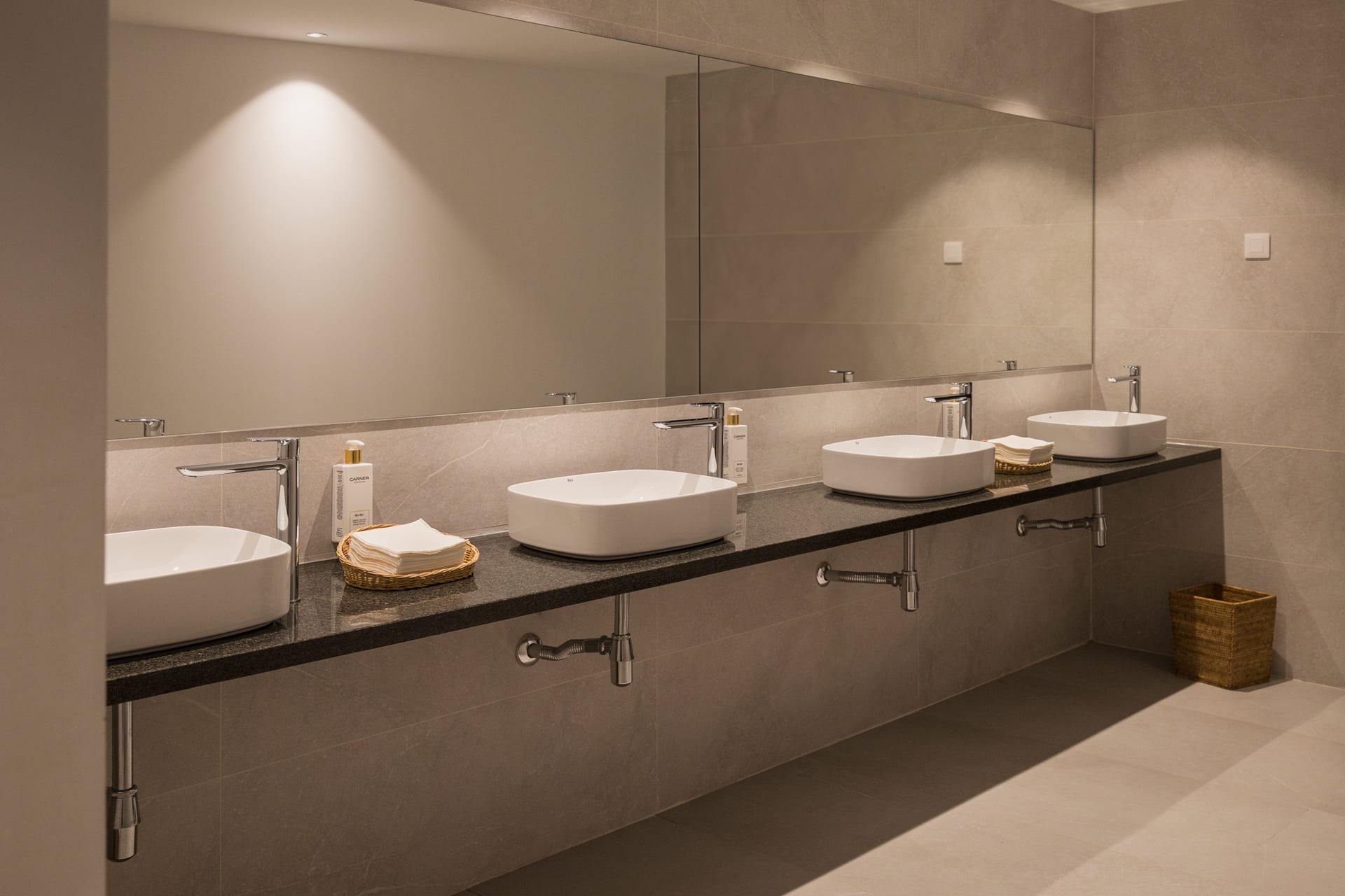Οι δημόσιες τουαλέτες του ξενοδοχείου έχουν μοντέρνα, καθαρή αισθητική. Ένας μακρύς πάγκος με σύγχρονους επικαθήμενους νιπτήρες Ona δημιουργεί έναν χώρο κομψό και λειτουργικό. Στους ανδρικούς χώρους υπάρχουν ουρητήρια Mural, ενώ στους γυναικείους χρησιμοποιούνται λεκάνες The Gap Round back‑to‑wall.