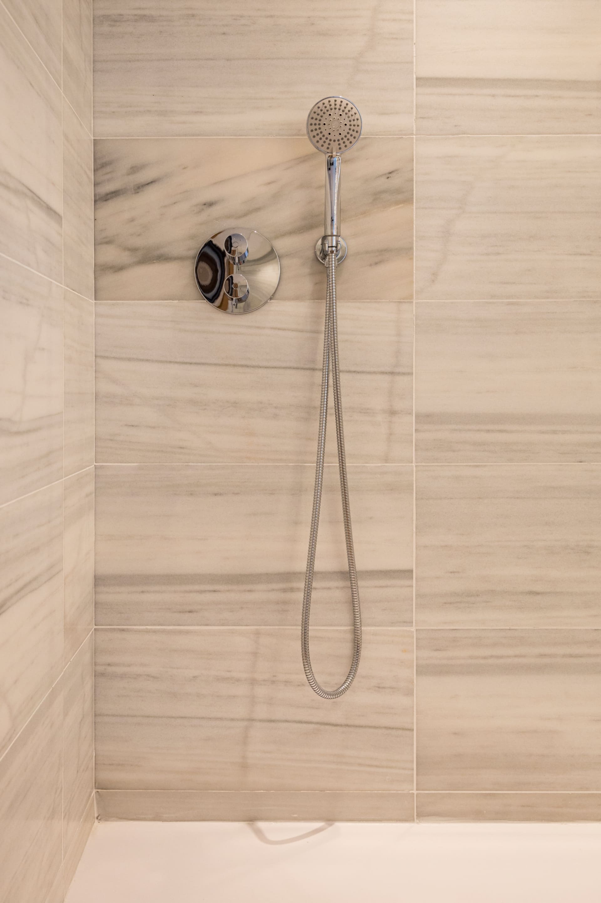 Σε άλλα δωμάτια, η εμπειρία του ντους έχει σχεδιαστεί με εξαιρετική προσοχή στη λεπτομέρεια. Η αντιολισθητική βάση ντους Terran από Stonex®, με τη ζεστή υφή της προσφέρει άνεση, ενώ η θερμοστατική μπαταρία T‑500 εξασφαλίζει ιδανική θερμοκρασία σε κάθε χρήση. Ο συνδυασμός premium υλικών και καινοτόμων τεχνολογιών δημιουργεί μια πραγματικά πολυτελή εμπειρία, σύμφωνη με τη δέσμευση του ξενοδοχείου για ευεξία.