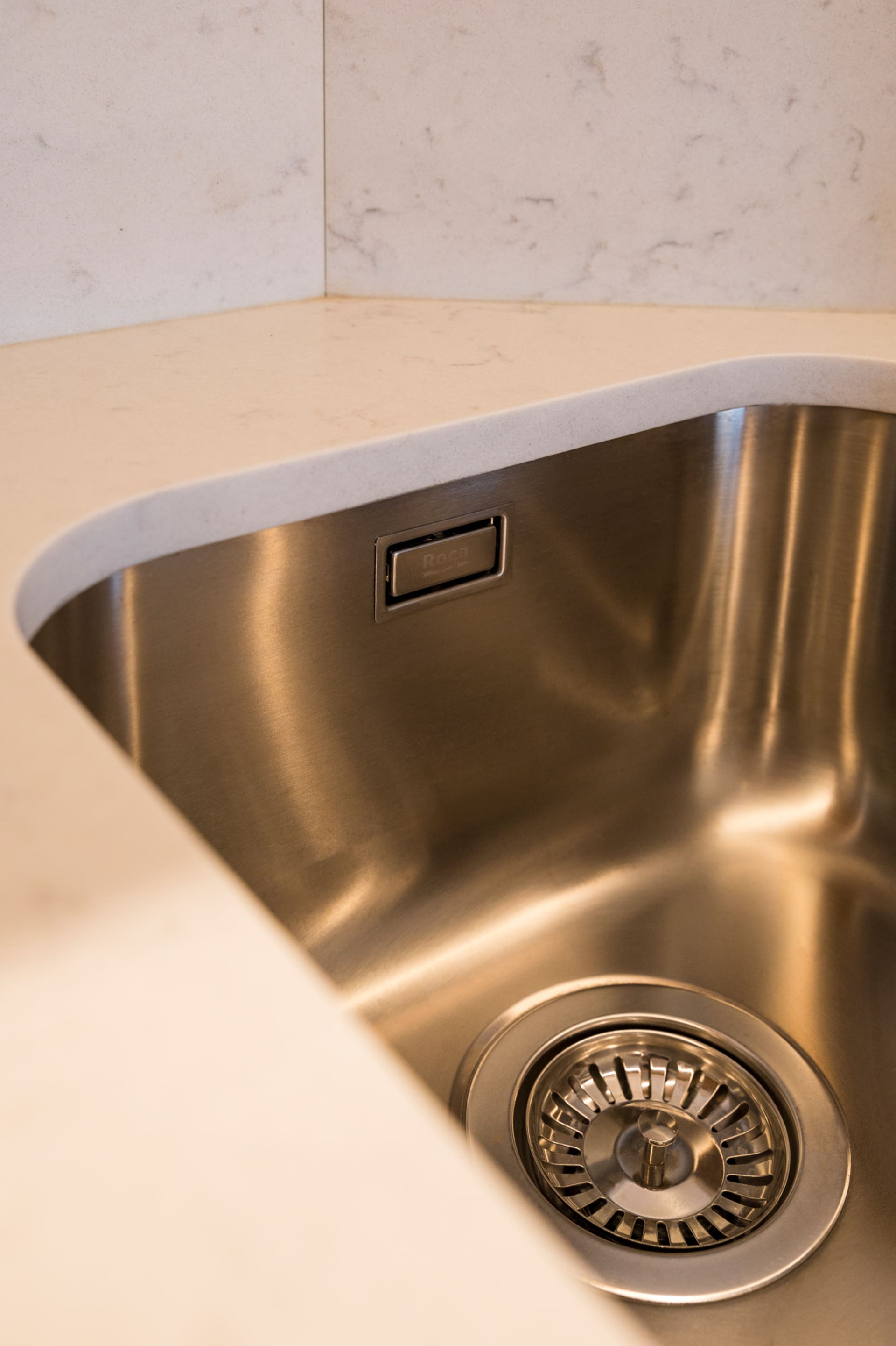 Η σουίτα Long Stay διαθέτει μικρή κουζίνα με ανοξείδωτο νεροχύτη Porto και μπαταρία Ona L‑spout σε χρωμέ φινίρισμα. Η σειρά Porto είναι γνωστή για την μη πορώδη επιφάνειά της και τον στρογγυλεμένο σχεδιασμό της, που διευκολύνει τον καθαρισμό και ενισχύει την υγιεινή αποτελώντας μια προσεγμένη επιλογή που προσφέρει λειτουργικότητα και κομψότητα σε όσους διαμένουν για μεγαλύτερο διάστημα.