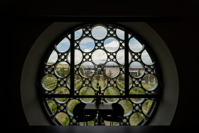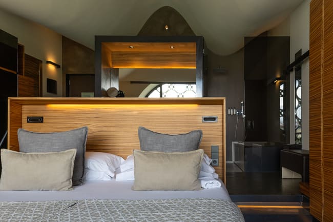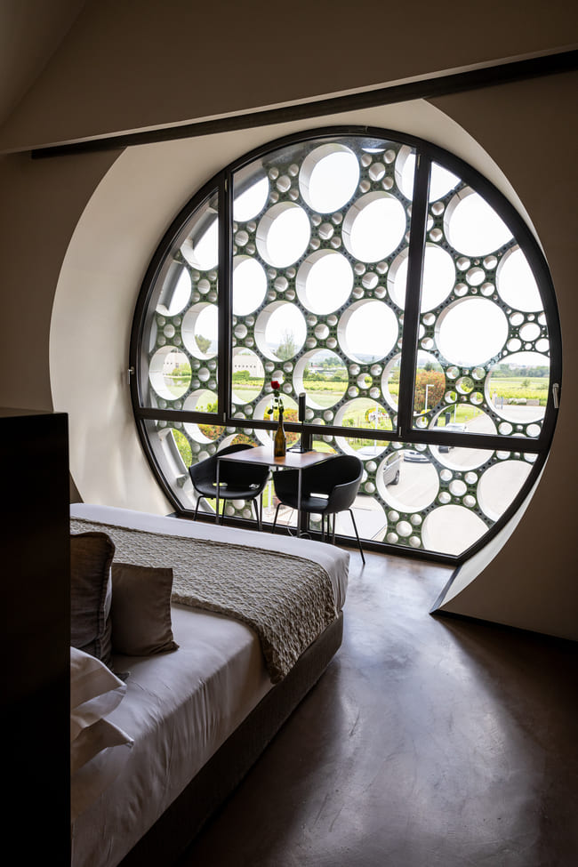 Στο εσωτερικό, το ξενοδοχείο συνεχίζει να αντλεί έμπνευση από το φυσικό του περιβάλλον. Στα υπνοδωμάτια, οι καμπυλόμορφες γραμμές του κτιρίου μεταφράζονται σε ομαλές, καμπύλες οροφές που ενισχύουν την αίσθηση του χώρου. Μεγάλα, κυκλικά παράθυρα με γεωμετρικά μοτίβα επιτρέπουν στο φυσικό φως να πλημμυρίζει τα δωμάτια, προσφέροντας εντυπωσιακή θέα στους αμπελώνες. Η χρήση ξύλου, γυαλιού και μαύρων λεπτομερειών δημιουργεί μια συνεκτική και κομψή αισθητική που ισορροπεί τον σύγχρονο σχεδιασμό με τα φυσικά στοιχεία.