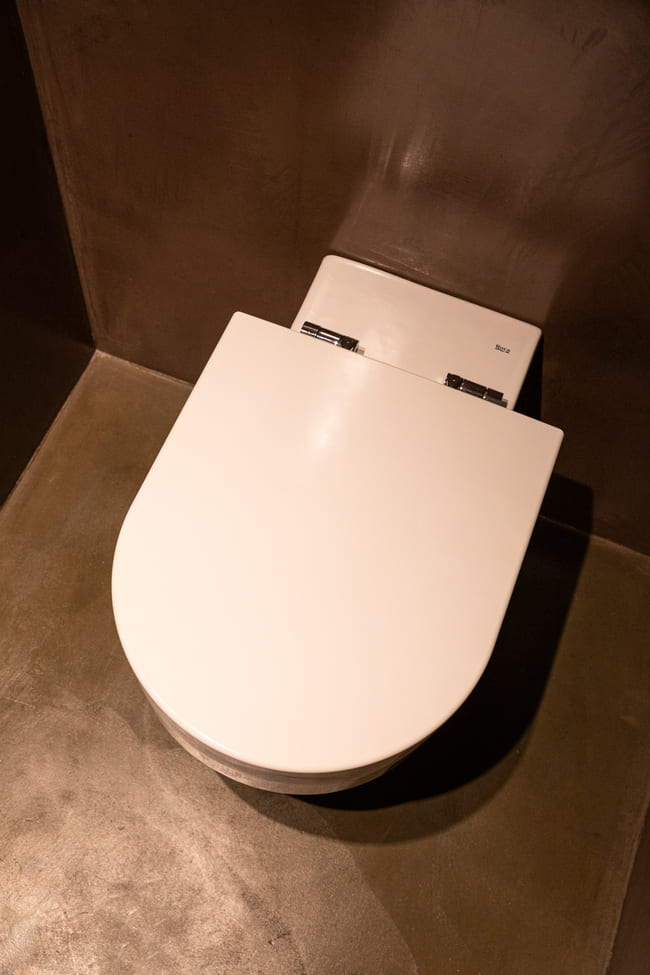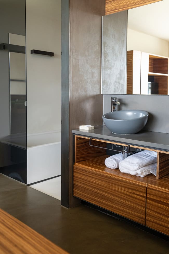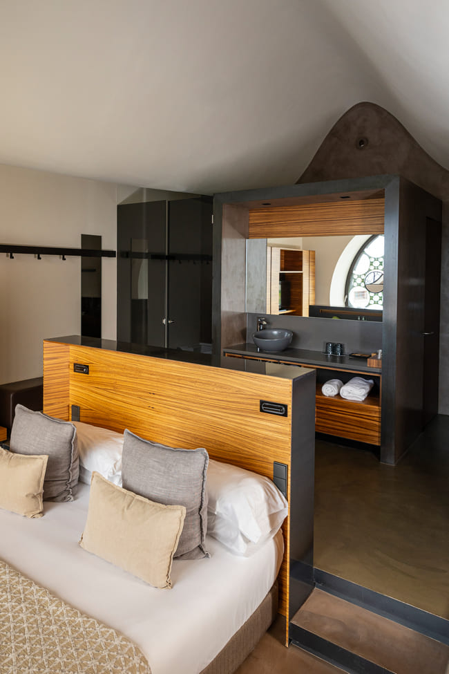 Οι εκφραστικές μπαταρίες Thesis, σχεδιασμένες από τον Antonio Bullo, με καθαρές γραμμές και μινιμαλιστικές φόρμες, προσθέτουν κομψότητα και δυναμισμό. Ο ιστορικός νιπτήρας Bol σε graphite απόχρωση, τοποθετημένος σε ξύλινο πάγκο, καθώς και η αρχιτεκτονική λεκάνη Happening, ενισχύουν τη σοφιστικέ αισθητική των δωματίων, ενδυναμώνοντας τη σύνδεσή τους με το συνολικό αρχιτεκτονικό όραμα του ξενοδοχείου και του περιβάλλοντός του. Αυτά τα στοιχεία αποδεικνύουν πώς ο σύγχρονος σχεδιασμός μπορεί να συνυπάρξει αρμονικά με παραδοσιακές αναφορές, δημιουργώντας χώρους που είναι ταυτόχρονα λειτουργικοί και οπτικά συναρπαστικοί.