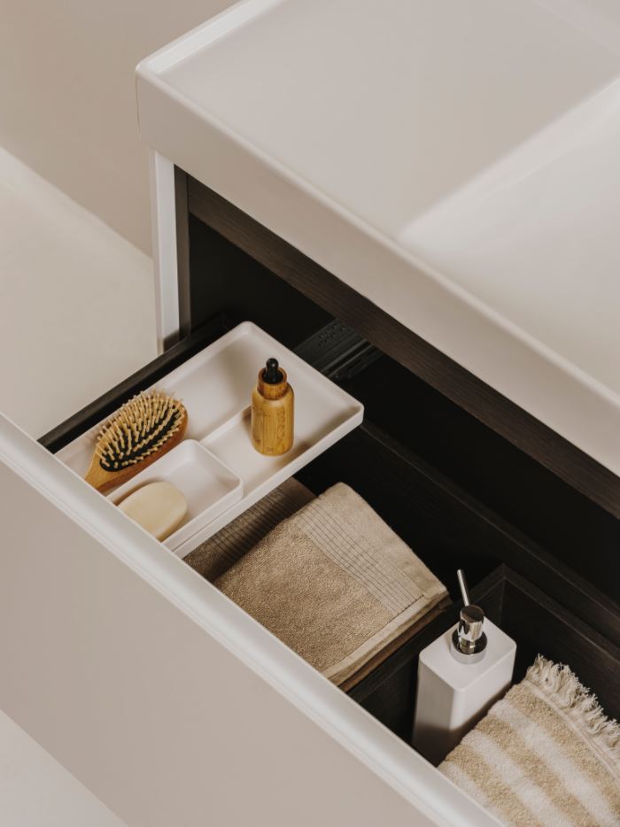 Η συλλογή έχει σχεδιαστεί για να ανταποκρίνεται αβίαστα σε κάθε ανάγκη. Ανάλογα με το μέγεθος του επίπλου μπάνιου, υπάρχει η επιλογή ενός ή δύο συρταριών,ενώ τα πλήρως αποσπώμενα συρτάρια με μηχανισμό soft-close προσφέρουν μεγαλύτερη άνεση στη χρήση. Στα έπιπλα υπάρχει η δυνατότητα να προσαρμόσετε θήκες οργάνωσης για να έχετε πάντα όλα τα προσωπικά σας αντικείμενα σε τάξη.