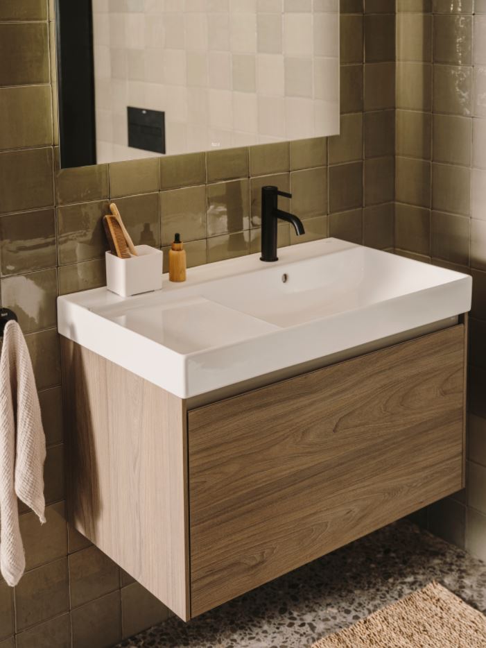 Τα compact έπιπλα συμβάλλουν στην εξοικονόμηση χώρου, ενώ προσφέρονται με την επιλογή μονής πόρτας ή διπλού συρταριού. Για μεγαλύτερη βελτιστοποίηση του χώρου, η Ona διαθέτει έπιπλα μικρού βάθους για ένα πιο άνετο μπάνιο.